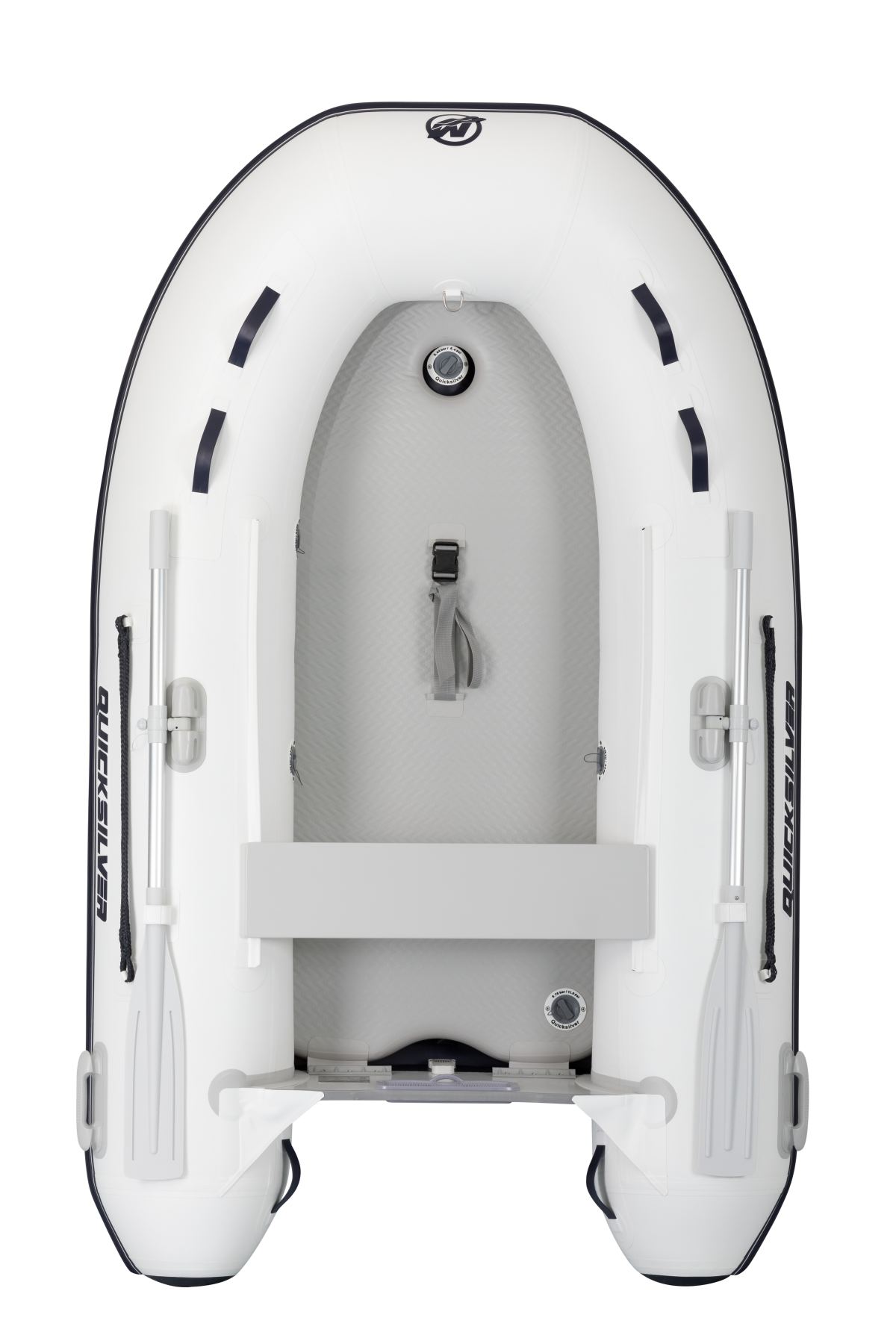 Her får du en luksus gummibåd, der både egner sig til hygge og leg på vandet, og til at have med på en større båd. Udarbejdet i robust hvid PVC med kraftig blå Quicksilver markering.